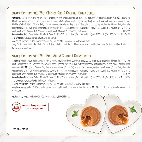Thrill your feline connoisseur with the innovative dual-texture recipes found in Purina Fancy Feast Savory Centers Adult Wet Cat Food Pate With a Gravy Center Variety Pack. Made by Fancy Feast, the number 1 cat food brand (based on sales as of April 2025), this cat pate offers her the delicate, smooth texture she loves without sacrificing the thick, savory gravy she craves. These hidden gourmet gravy cat food center recipes are like buried treasures just waiting for her delighted discovery. Made with real, high-quality ingredients, this delicious Fancy Feast Savory Centers Pate Wet Cat Food Variety Pack provides 100 percent complete and balanced adult nutrition. She gets the great flavors of chicken, salmon, beef, or tuna and you get peace of mind knowing her meals contain essential vitamins and minerals that support her overall health. Open each canned cat food pate when your meat-loving feline is in the mood for something special and delicious. Be sure to check out individual flavors of Fancy Feast Savory Centers With Chicken Pate, With Tuna Pate, With Beef Pate or With Salmon Pate.
