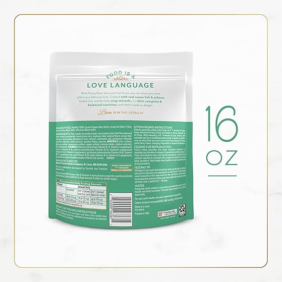 Delight your cat every day with a dish of Purina Fancy Feast Gourmet Dry Cat Food With Ocean Fish & Salmon and Accents of Garden Greens, and feed her nutritional needs along with her desire for delicious taste and satisfying textures. Multiple shapes draw her to her bowl, and the colorful variety keeps her there. She can dig into the crunchy texture that cats crave while enjoying delicious flavors they adore. Your cat's getting 100% complete and balanced nutrition for adult cats in a high-quality cat dry food you can feel good about giving her. Made with a variety of seafood and accents of garden greens, this premium Purina dry cat food offers a gourmet taste that's formulated just for cats--taking dry cat food to the next level. Satisfy your feline friend's need for deliciousness while also providing essential vitamins and minerals to help support her health by filling her bowl with this Purina Fancy Feast Gourmet Dry Cat Food With Ocean Fish & Salmon and Accents of Garden Greens.