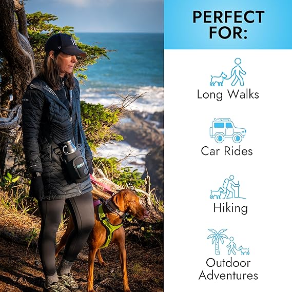- EASY PORTABILITY WITH CONVENIENT NEOPRENE CARRY BAG - With its included neoprene carry bag, this dog food and water bowl set with puppy bowls offers ultimate portability. The adjustable strap allows you to carry the bottle hands free. Whether you're going on a hike, heading to the park, or traveling, this lightweight dog water bottle portable makes staying hydrated easy. The neoprene bag protects the bottle and the zipper compartment holds poop bags for dogs, your phone, wallet, and keys.