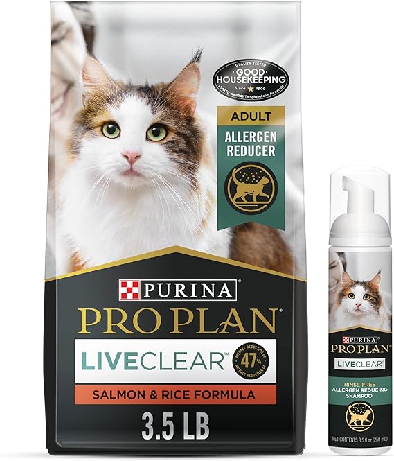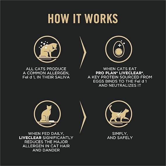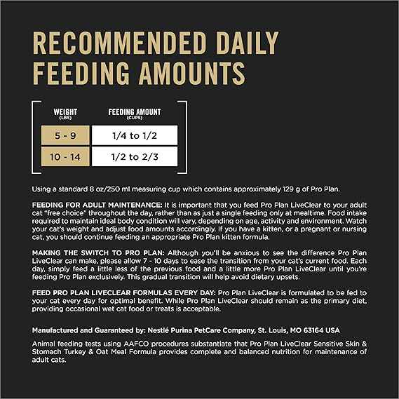 Cuddle up with your cat when you try Purina Pro Plan LIVECLEAR Adult Weight Management Formula dry cat food. The first and only line with the power to reduce cat allergens, Purina Pro Plan LIVECLEAR cat food significantly reduces the major allergen in cat hair and dander. It's backed by over a decade of research and simply and safely neutralizes Fel D1, a common allergen in cat saliva, with a key protein from eggs. It's shown to reduce the allergens in cat hair and dander by an average of 47 percent starting in the third week of daily feeding. The weight control cat food helps support her unique nutritional needs. It has 20 percent less fat than LIVECLEAR Chicken and Rice, and the high protein cat dry food helps promote muscle mass maintenance during weight loss. It's fortified with guaranteed live probiotics for digestive health and immune health. Our revolutionary Purina cat food offers outstanding nutrition in an allergen-reducing, weight control dry cat food that improves time spent with your cat.
