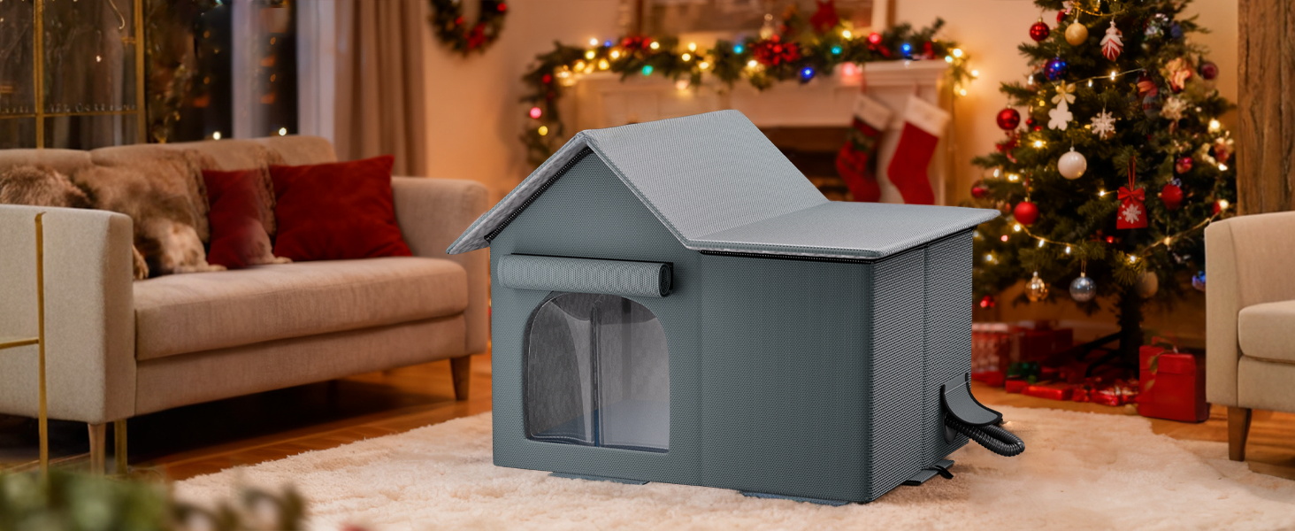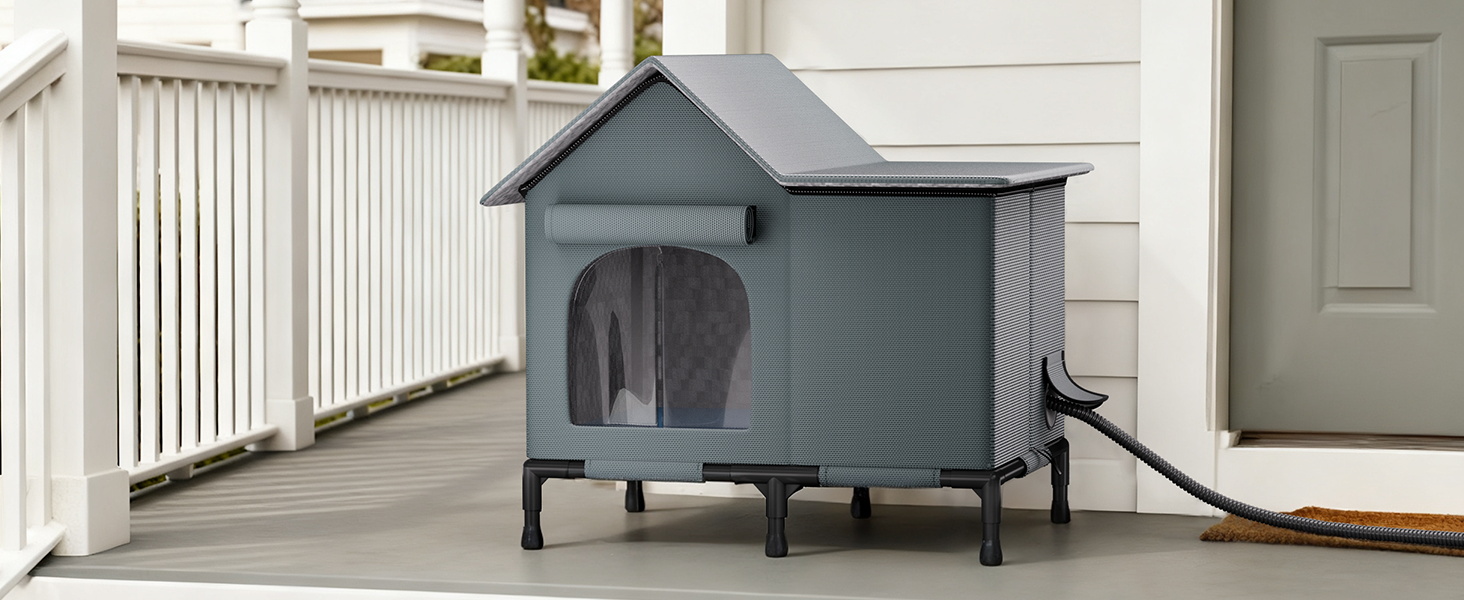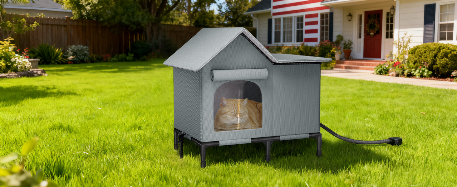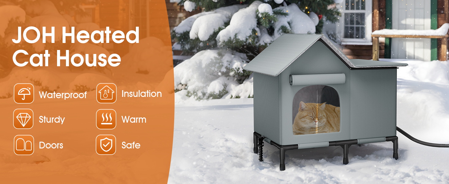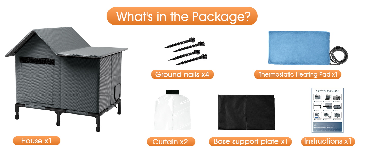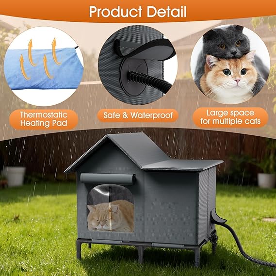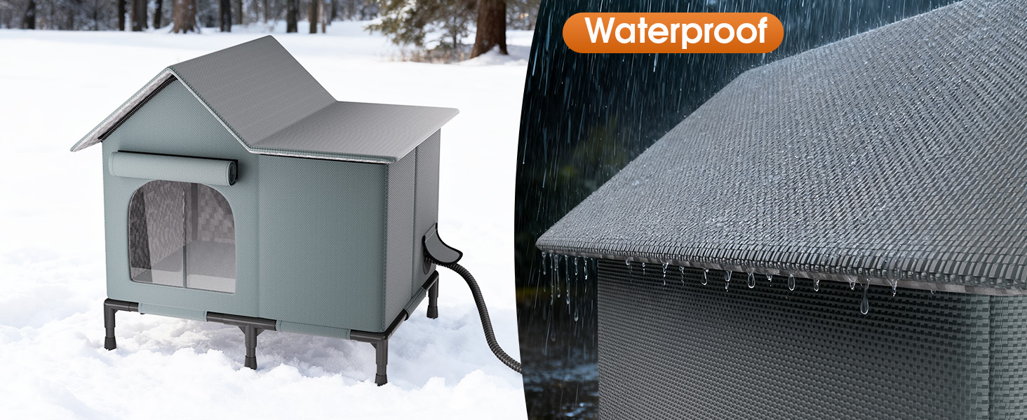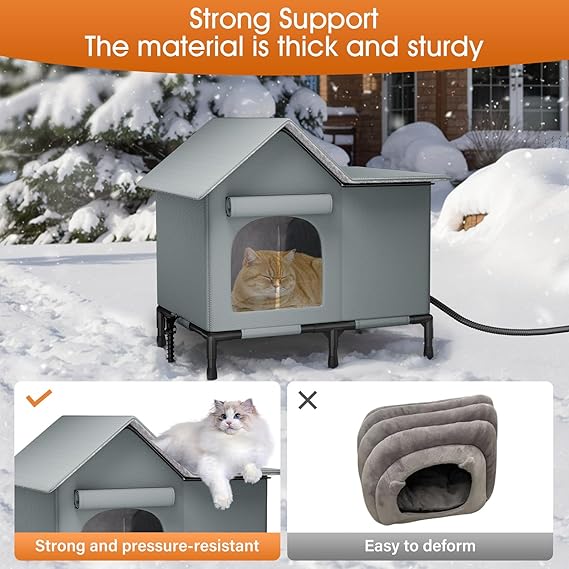 - 【 Weatherproof & Wind-Resistant 】Equipped with an elevated moisture-proof base, this heated cat house ensures the pet remains dry and comfortable even on rainy or snowy days. Additional ground stakes and anti-wind straps are included for reinforcement, making the structure exceptionally stable and resistant to strong gusts. The waterproof roof and sealed seams provide complete protection from the elements.