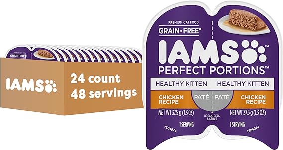 IAMS Perfect Portions Healthy Kitten Grain Free Wet Cat Food Pate, Chicken Recipe, 2.6 oz. Easy Peel Twin-Pack Trays (24 Count, 48 Servings)