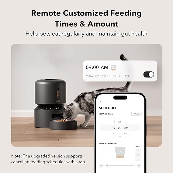 - Never Miss A Meal: Easily schedule up to 10 meals per day and 1-48 portions per meal (1/12 cup each portion) with the Wi-Fi automatic cat feeder, you can easily customize your furry friend's feeding plan and check the feeding records to ensure your cat has been fed on a set schedule by the APP.