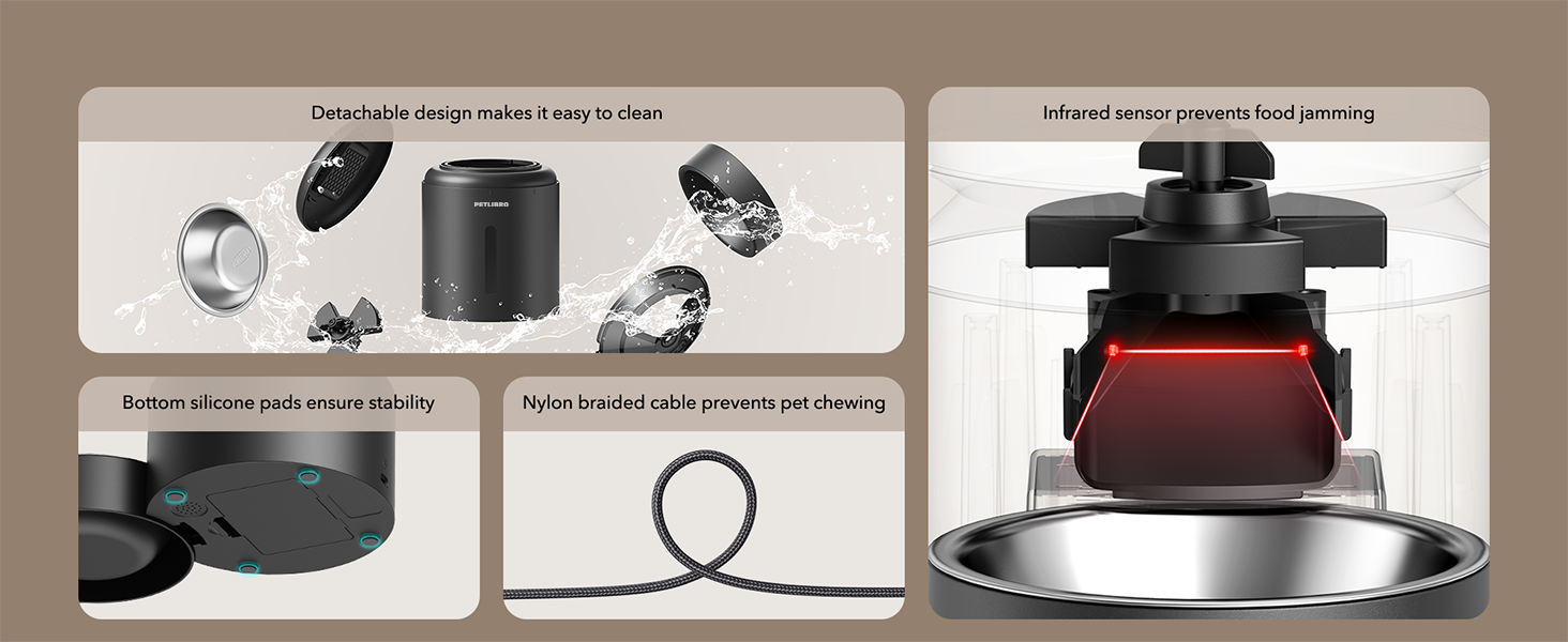 - Freshness in Every Bite: Patent rotor in the tank base and twist-lock lid of the automatic pet feeder prevent pets sneaking into the food dispenser for extra food. Built-in desiccant bag and sealing strip keep food fresh and crunchy. Food-grade stainless steel bowl provides healthy and hygienic feeding, saving your pets from chin acne.