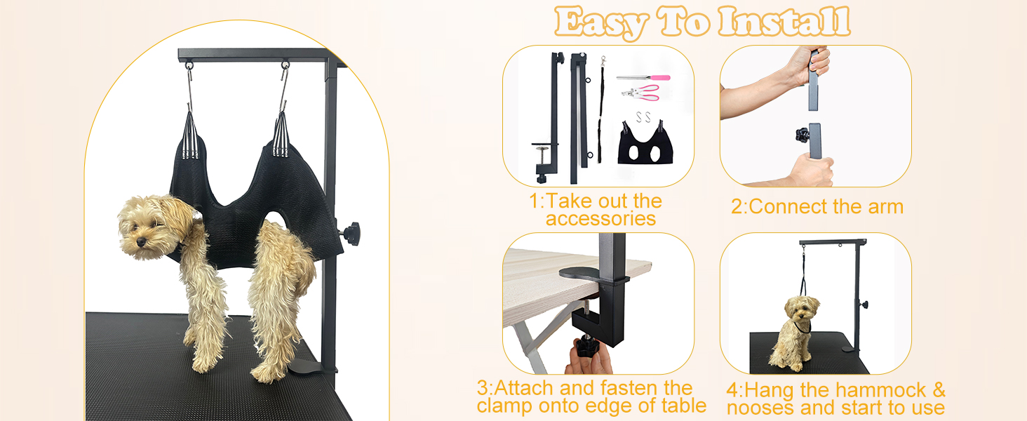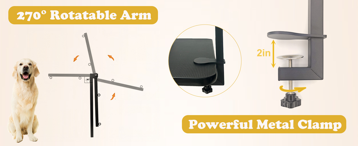 - Quick Setup & Space-Saving Foldable Design The dog grooming arm installs in 1-2 minutes with a sturdy clamp (fits tables up to 2" thick). When not in use, simply fold it flat for compact storage. No tools required! Ideal for small apartments or mobile pet groomers.