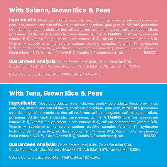 Bring the bounty of the sea to your cat’s dish with a Purina Friskies Ocean Favorites Pate Cat Food 24-Count Variety Pack. With four scrumptious Purina wet cat food recipes and two lip-smacking textures to choose from, it’s easy to surprise them with a different entree at each meal. Each wet cat food entree of pate or meaty bits in cat gravy with salmon or tuna provides high-quality protein cats need for muscle strength. Visible accents of brown rice or peas in each Friskies canned cat food recipe stimulates her interest. Friskies Ocean Favorites canned cat food pate recipes are made without artificial colors or preservatives to meet your ingredient preferences. Whether they’re nibbling on a loaf of soft Friskies pate cat food or savoring the tender chunks in gravy cat food, your cat gets 100 percent complete and balanced nutrition per serving. Treat your feline to whisker-licking variety she’ll go wild for with the Purina Friskies Ocean Favorites 24-Count Canned Cat Food Variety Pack.