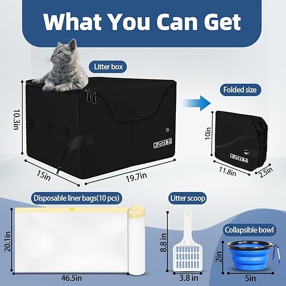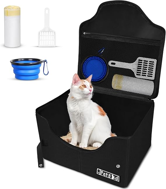 Petskd Portable Travel Litter Box for Cats with Lid and 10 pcs Liner Bags, Light Weight, Leak-Proof and Higher Sides for Road Trips, Hotel Stays, Car Travel(Black)