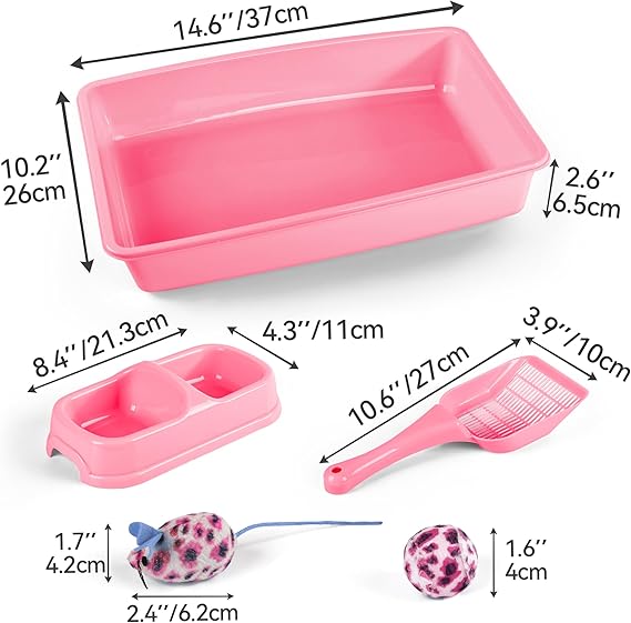 PAWISE Small Cat Litter Box Kit for Kittens - 5‑Piece Kit with Low Entry Litter Pan, Scooper, Feeding Bowls & Mouse Toy - Cat Starter Set for New Kitty Home, Pink