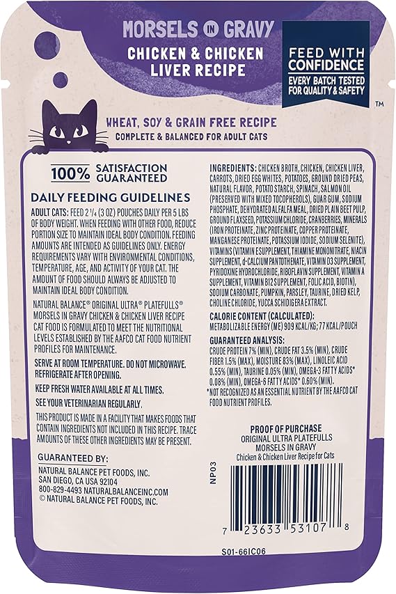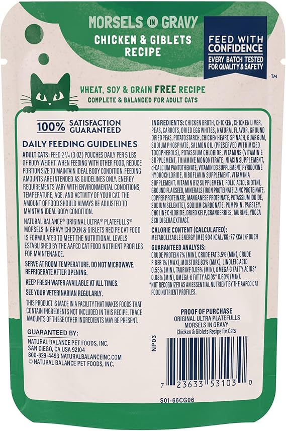 Natural Balance Platefulls Chicken Morsels in Gravy Variety Pack Wet Cat Food bring an abundance of taste and nutrition to your cat's bowl. We have crafted this morsels in gravy cat food with premium ingredients cats crave. In this wet cat food, chicken provides an excellent source of protein to support healthy muscles and chicken liver adds extra protein and flavor. Veggies like carrots and potatoes add fiber to help support healthy digestion. This chicken liver cat food is made with taurine to help support heart health and Omega 3 and Omega 6 fatty acids to help support healthy skin and a beautiful coat. Serve this chicken cat food as a complete and balanced meal for adult cats, or a topper over kibble. This savory morsels in gravy cat food is grain-free and provides high-quality protein mixed with wholesome vegetables and fruit including peas, carrots, cranberries, and more. Served in a tasty cat food gravy, this Platefulls wet cat food variety pack feature three delicious flavors: Chicken & Giblets, Chicken & Sweet Potato, and Chicken & Chicken Liver.