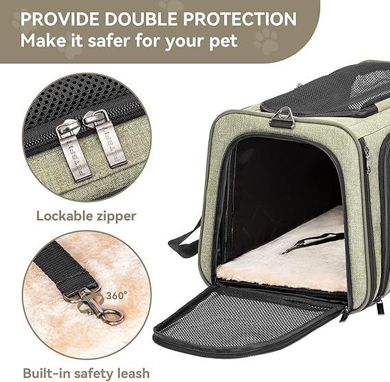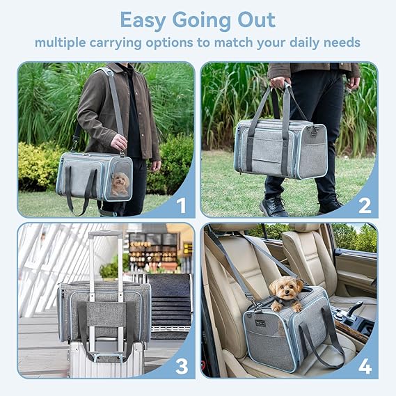 Petsfit Expandable Cat Dog Carrier Airline Approved, 17" L x 11" W x 11" H Soft-Sided Portable Pet Travel Carrier for Kitten, Puppy, Removable Soft Plush Mat and Pockets, Auto-Locking Zippers