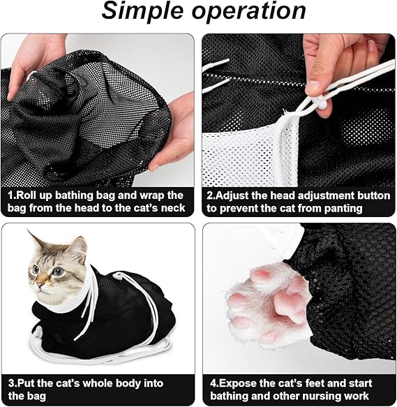 - 【Adjustable Drawstring】Cat bath bag covers the cat’s whole body, with 5 drawstrings. The new headgear drawstring is added to prevent being bitten by the cat’s teeth, and the foot drawstring prevents being scratched by the cat’s claws, easy to cut nails. The middle drawstring can better fix the cat’s body to prevent the cat from running away.