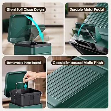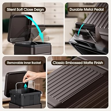 - Silent Soft Close: The step trash can has a damper arrangement that retards the close of allows the lid to close quietly and safely by itself every time, don’t worry about disturbing the rest of your family