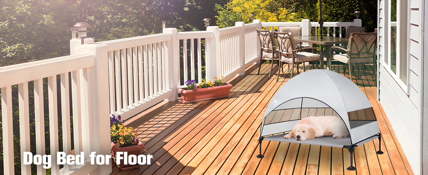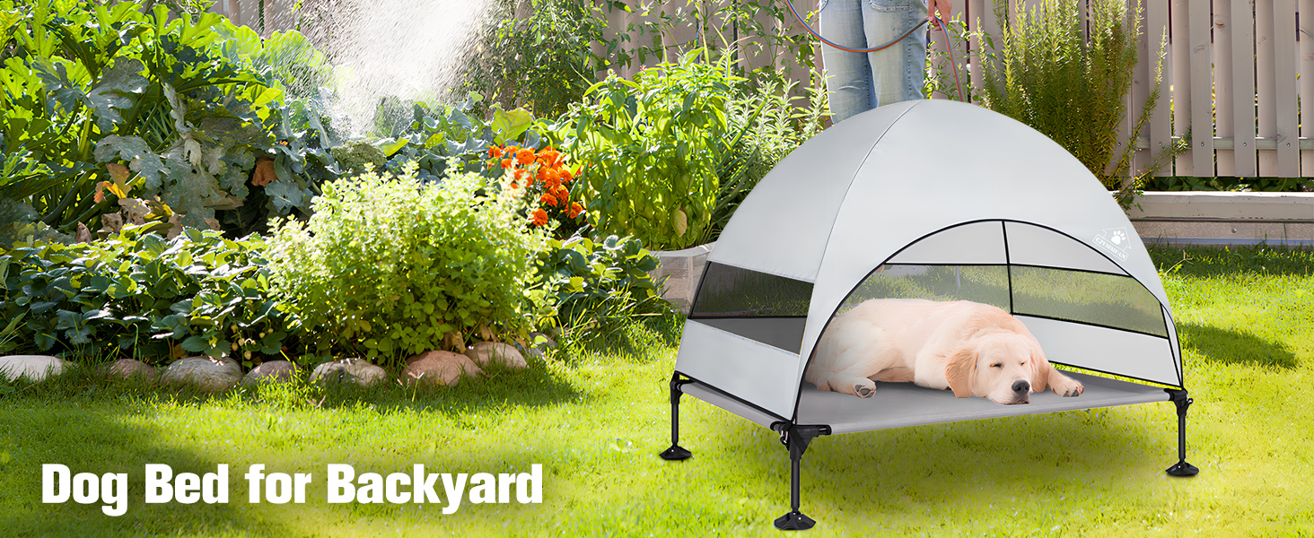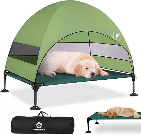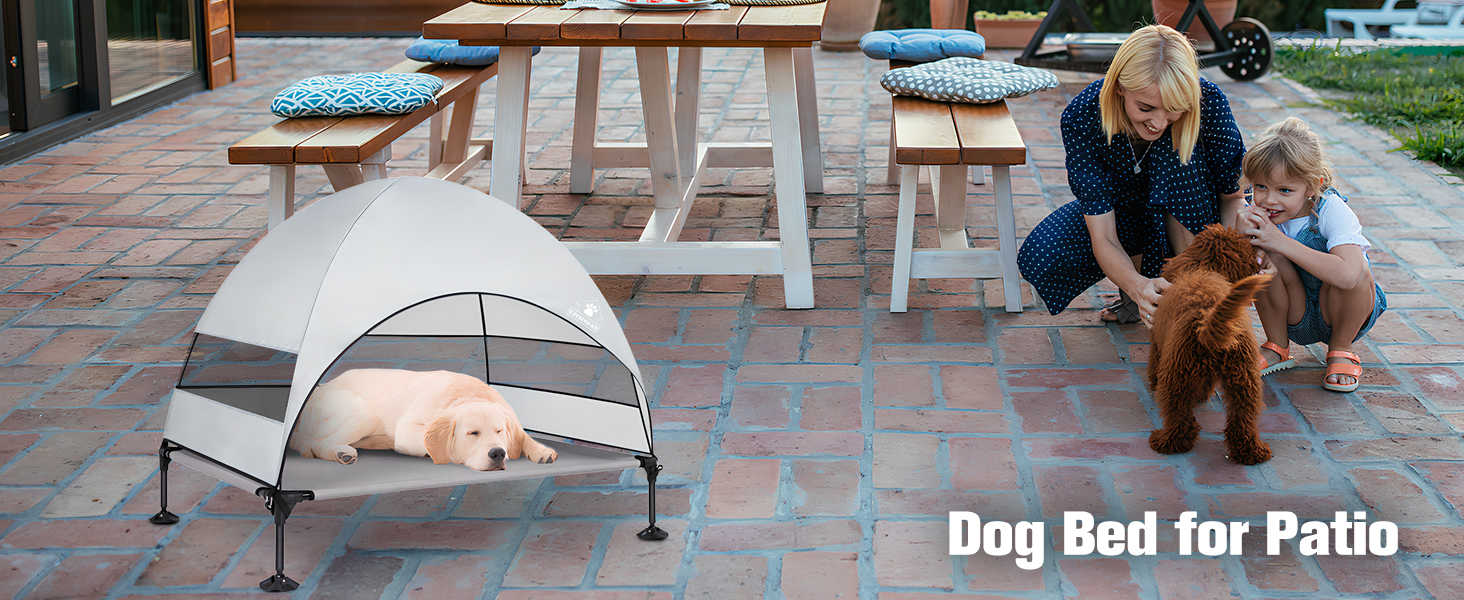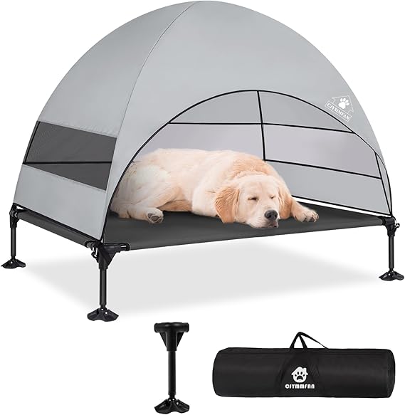 - 【Upgraded Oversized Canopy】Our outdoor dog bed comes with a large waterproof and UV-proof canopy that provides great shade and protection from the sun. The mesh piecing on three sides enhances airflow and maintains a clear sight for dogs. The bed also ensures that pets can relax outside comfortably during the summer season.