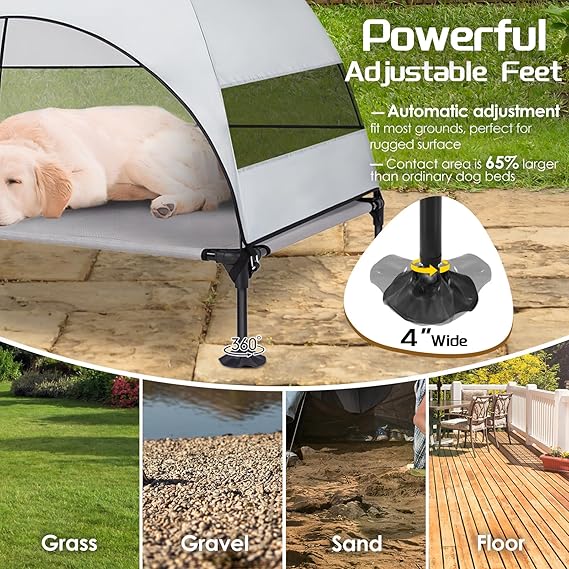 Elevated Dog Bed with Upgraded Canopy, Raised Outdoor Dog Tent with Powerful Anti-Slip Feet, Portable Pet Cot with Larger Shade, Raised Cooling Bed for Camping, Backyard, Beach, Poolside