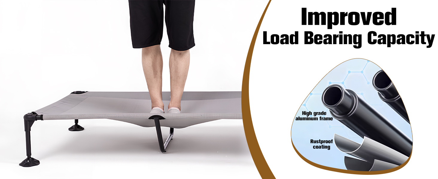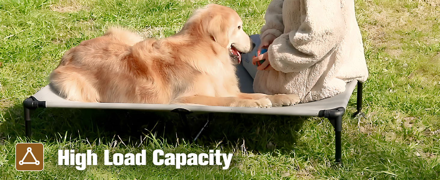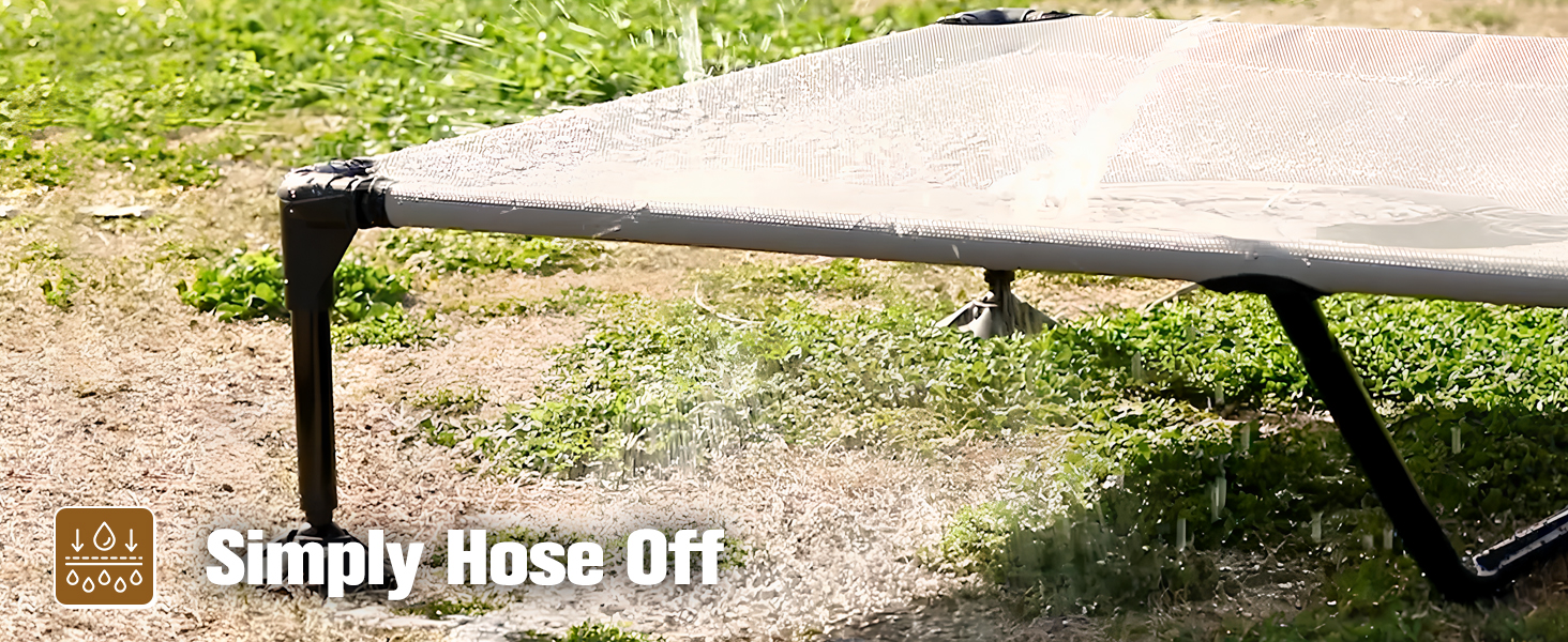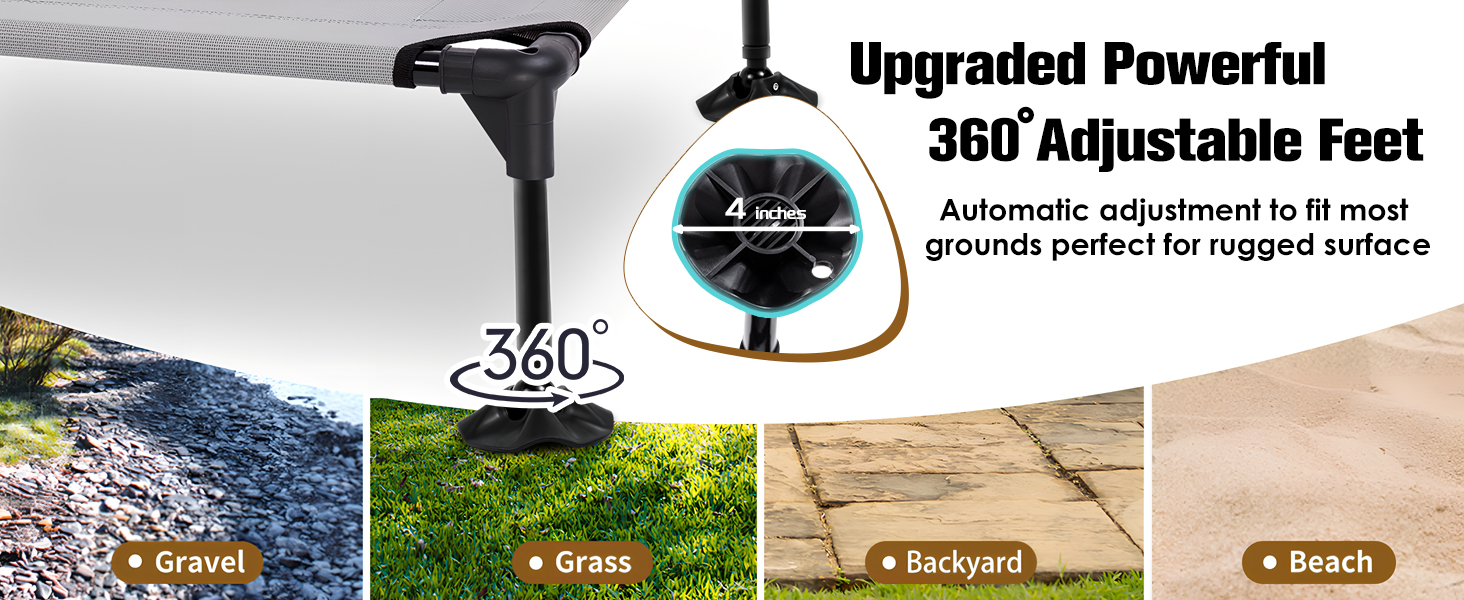 - 【Superior Stability with Unique Powerful Feet】The elevated dog bed boasts unique feet, which create a large contact area with the ground and feature a special bottom structure for exceptional grip. This innovative design enables the outdoor dog bed to stand much more stably than other pet beds, even on rugged terrain, such as beaches, hillsides, grass, and gravel.