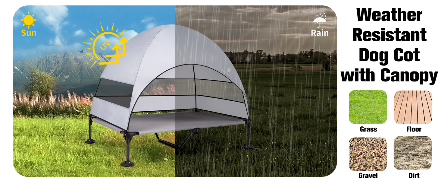 - 【All-Weather Ready】Harsh UV rays? No problem! The upgraded canopy blocks up to 90% of sunlight, creating a shaded oasis to prevent overheating. Perfect for beach days, poolside lounging, or summer hikes! The heavy-duty, water-resistant canopy acts like an umbrella, shielding your dog from sudden downpours or drizzle. Made with reinforced stitching, no flapping in windy weather! The elevated mesh bed keeps your pet dry above muddy puddles, so they stay clean even during rainy backyard or camping trips.
