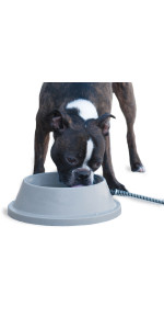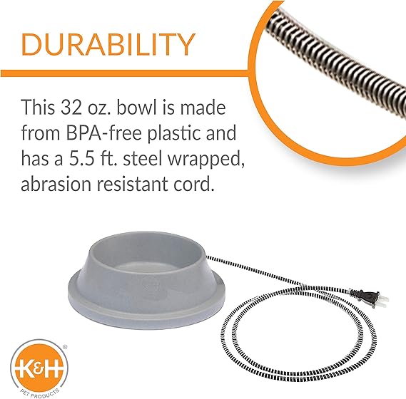 The K&H Pet Products Thermal-Bowl Outdoor Heated Cat & Dog Water Bowl makes water available for pets in even the most extreme cold temperatures. Thermostatically controlled, the Thermal-Bowl is the answer to freezing water bowls. Just plug it in and your pet’s water will remain open all winter. All electronics are safely sealed inside, and the cord is steel wrapped to prevent abrasion. These outdoor heated water bowls use anywhere between 12 and 25 watts depending on the size, making them all good choices for low energy consumption. Indoor or outdoor use. This heated water bowl has been tested & certified by MET Labs and exceeds USA/CA electrical safety standards. K&H doesn't just use safety listed parts; we safety certify the entire product. Available in 4 sizes: Granite gray color is 1.5 gallons; Blue color is 96 ounces; Gray color is 32 ounces; and Stainless Steel is 102 ounces. Designed by K&H with OVER 20 years of experience in creating safe, innovative, quality products for pets. One-year limited warranty.