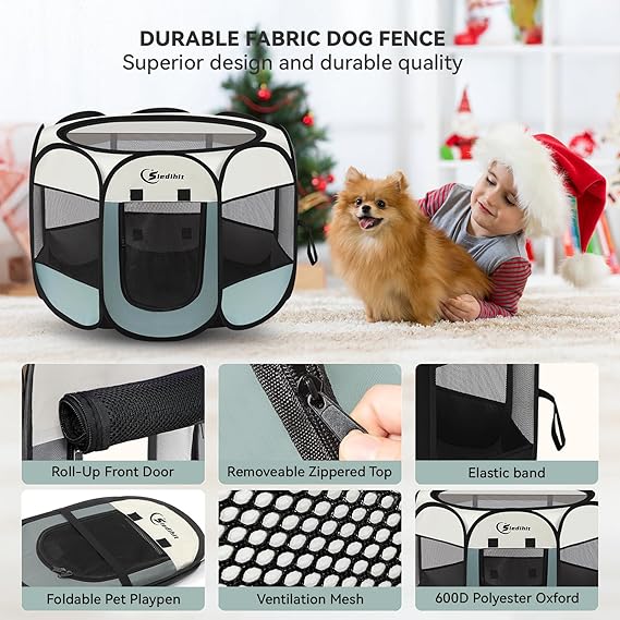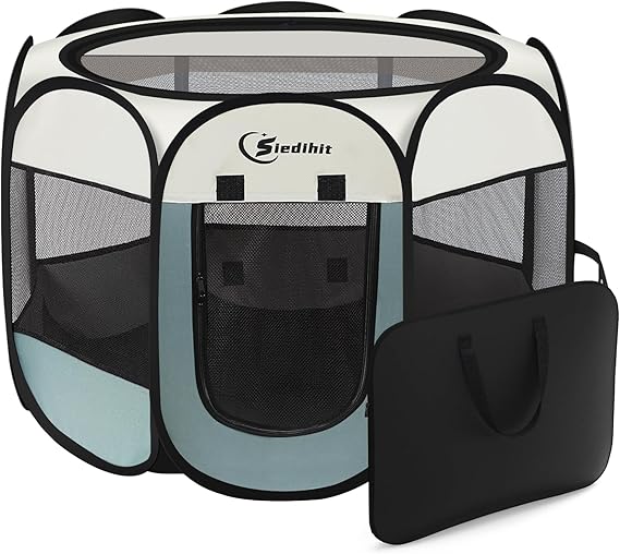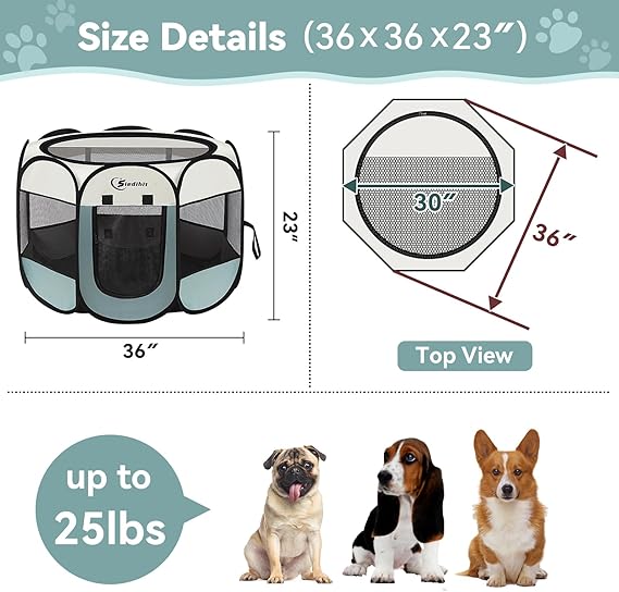- 【No Assembly required】Opening the dog pen takes only a few seconds, is lightweight, strong, and does not require assembly. When not in use, it can be folded into the tote bag provided by us, which takes up minimal space and is easy to carry and store. Spacious interior Spaces allow your pet to play, sleep, hide or isolate. Perfect for indoors, lawns, beaches, parks, Tours, camping and more!