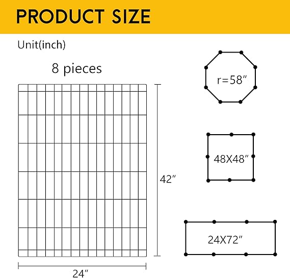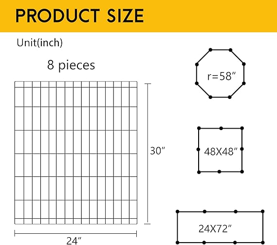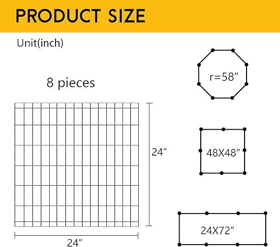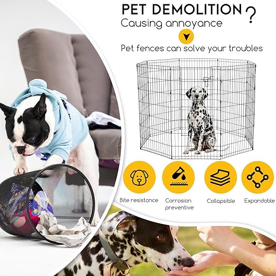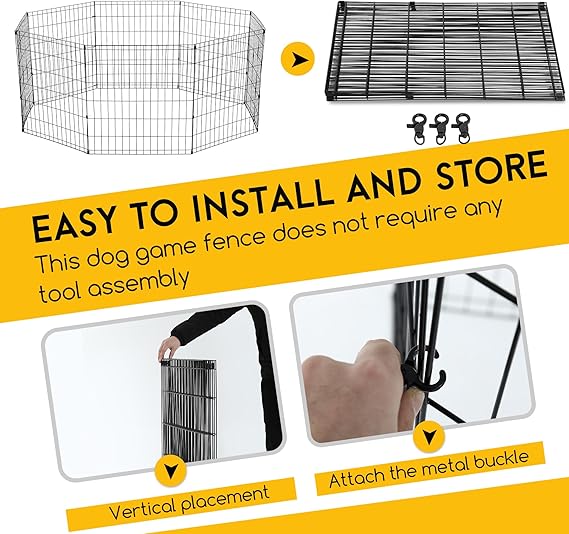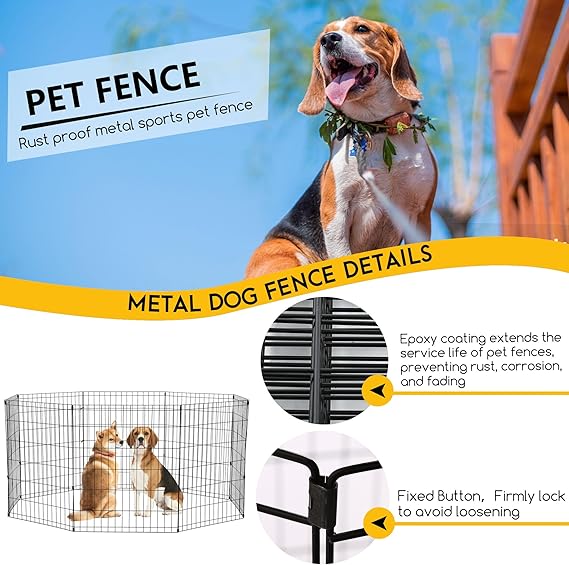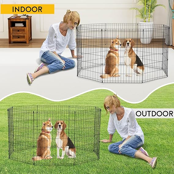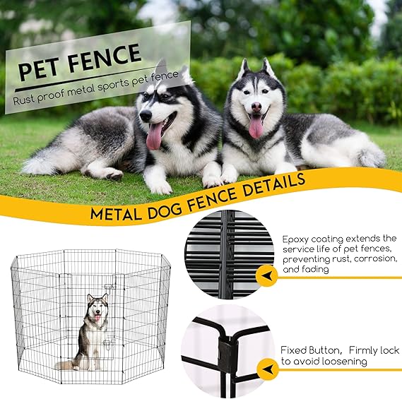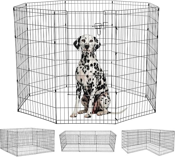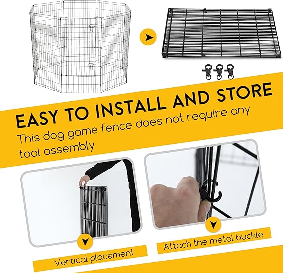 Our indoor and outdoor 8-Panel pet playpen is intended to give your furry friends a secure and spacious place to play! Our dog fence is made of sturdy materials offers flexibility, safety, convenience and can survive regular use under all weather conditions. The playpen can be customized into multiple shape configurations, including square, rectangle and octagon, to suit your space. Whether for puppies, small dogs or other small animals, this exercise pen provides a comfortable and secure environment. It is easy to clean and maintain, can be folded to fit into small spaces. Easy assemble and set up in a few minutes without the need of extra tools. If you have any questions, please contact us at any time.