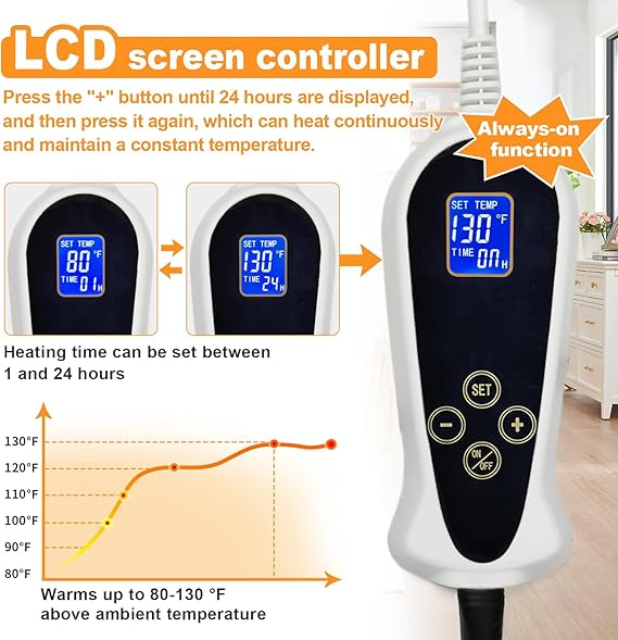 - 【Upgraded Switch】This heating pad for dogs adopts upgraded LCD display, you can view the temperature and time at the same time, provides 80-130℉ temperature control range, supports 1-24 hours free adjustment, new normally open ON function. The heating pad for pets is also equipped with power failure protection, designed for pets to avoid overheating, thus providing just the right amount of warmth for your pet.