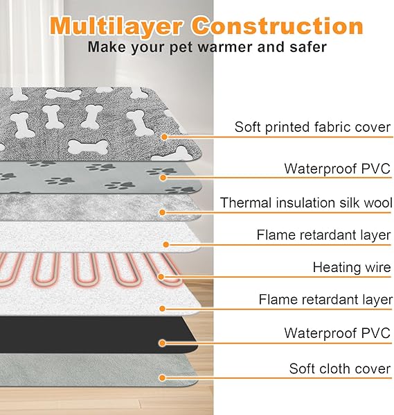 - 【Safety Structure Design】The pet heating pad is designed with 8 layers of protective structure, double helix heating wire, it can be heated up quickly in about 10 minutes, built-in UL certified electric heating wire and temperature sensor, it also adds waterproof and flame-retardant inner layer, and the carabiner reinforcement at the wire connection prevents it from being damaged by pets, you don't need to worry about leakage of electricity.