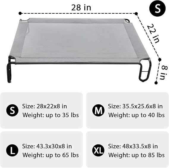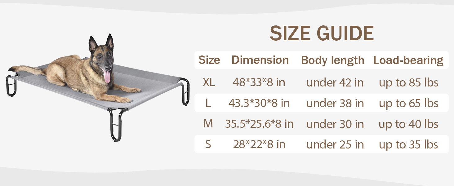 - Extra Large Dog Bed Dimensions: Pettycare Elevated Dog Cot Bed measures 48x33.5x8 inches. Fits up to 85 lbs. The 8" off-the-ground design promotes increased airflow on all sides of the raised dog bed, which helps keep your pet cool and creates low-impact areas to pressure points and joints, especially on rainy or hot days.