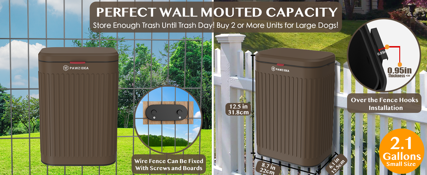 - WALL MOUNTED PREVENTS KNOCKING OVER: You can mount this dog trash can on the wall, hang it on the fence and outdoor garbage can, or hide it in the garden. It prevents dogs from bumping into or knocking over the trash can and making a mess.