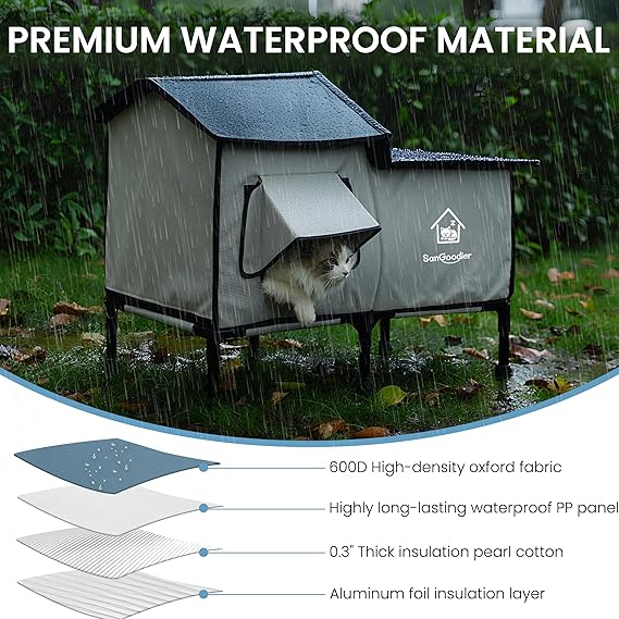 - Waterproof Design: Crafted from 600D high-density Oxford fabric and PP panel, combined with 0.3-inch thick pearl cotton and aluminum foil insulation layers, this cat house forms a rugged waterproof barrier to effectively repel rain and moisture. The dual-security system of zippers and hook-and-loop fasteners keeps the interior dry even in harsh weather conditions.