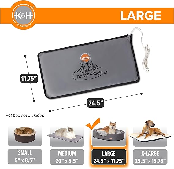 With the addition of a K&H Pet Products Pet Bed Warmer, any cat or dog bed can provide comfort and warmth to your pet. It can be placed inside virtually any pet bed and is easy to use. Just plug it in! It will become your cat or dog's favorite place to nap. Dual thermostats regulate temperature using very low wattage. The heater is set to keep the surface temperature of your pet's bed 12° to 15° above ambient air temperature when your pet's not in the bed; then it automatically warms to a pleasing 102°F when the pet lies upon the bed. K&H Pet Bed Warmers are tested & certified by MET Labs and exceed USA/CA electrical safety standards; K&H doesn't just use safety listed parts, we safety certify the entire product - For indoor household use with 110/120 volt electrical current only. NOTE: Do not use Pet Bed Warmer alone, must always be placed inside a pet bed. Not for outdoor use.
