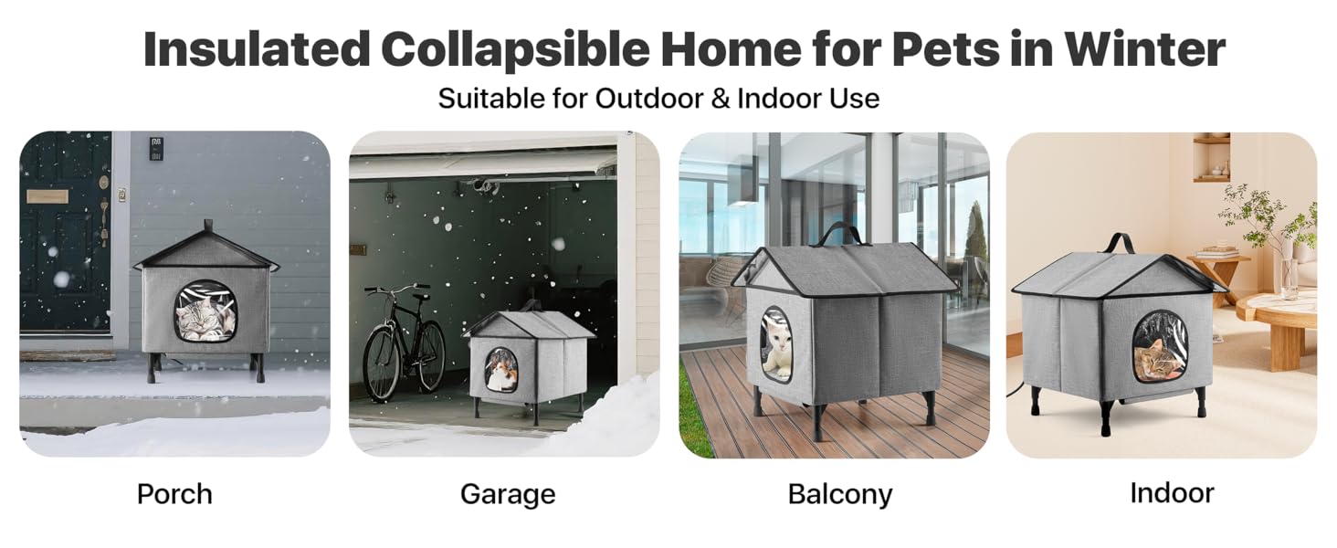 - Multi-Scenario Heated Cat Shelter: Perfect for outdoor or semi-outdoor settings, this cat shelter offers year-round comfort. Whether you're caring for indoor pets or providing a safe haven for stray or feral cats, this heated outdoor cat house meets all needs with warmth, durability, and thoughtful design