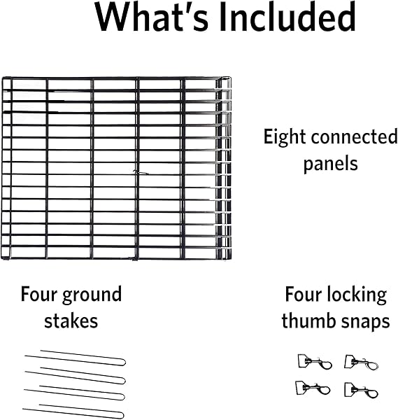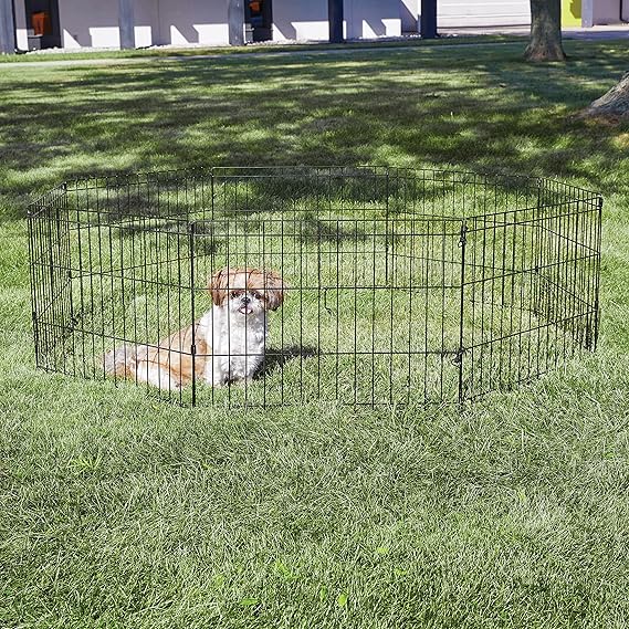The metal Exercise Pen / Pet Playpen by MidWest Homes for Pets provides a great enclosure to keep your pet safe and secure while indoors or outside. These Exercise Pens / Pet Playpens are made of durable metal wire that features a black E-coat finish for long lasting protection against rust and the elements. The black Exercise Pen / Pet Playpen by MidWest Homes for Pets consists of 8 - 24" wide panels and is available in 5 different heights. When fully expanded, the Exercise Pen / Pet Playpen provides your pet with 16 square feet of enclosed living area. Each durable metal Exercise Pen / Pet Playpen is simple to set up (no tools required) and includes 8 ground stakes for secure set-up while being used outdoors and 4 thumb-snaps for easy assembly. These versatile Exercise Pens / Pet Playpens can be used for a variety of pets and fold flat for convenient storage when not in use. Make sure to check out the additional Sunscreen or Wire Mesh Top for the Exercise Pen / Pet Playpen if you want to add additional security or shade to the pen when using it outdoors. As always, MidWest Homes for Pets stands behind the quality of our products with a 1 year Manufacturer's Warranty.