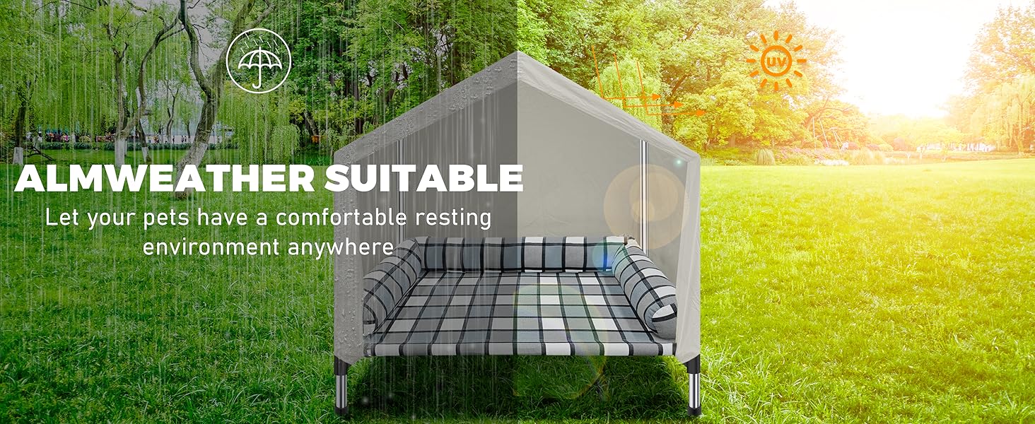 - 【WINDPROOF, RAINPROOF & SUNPROOF】 This dog bed with tent shields your pet from wind, rain. The sunproof & weather-resistant design breathable design ensures airflow for cool comfort, making it perfect for outdoor adventures or backyard relaxation.