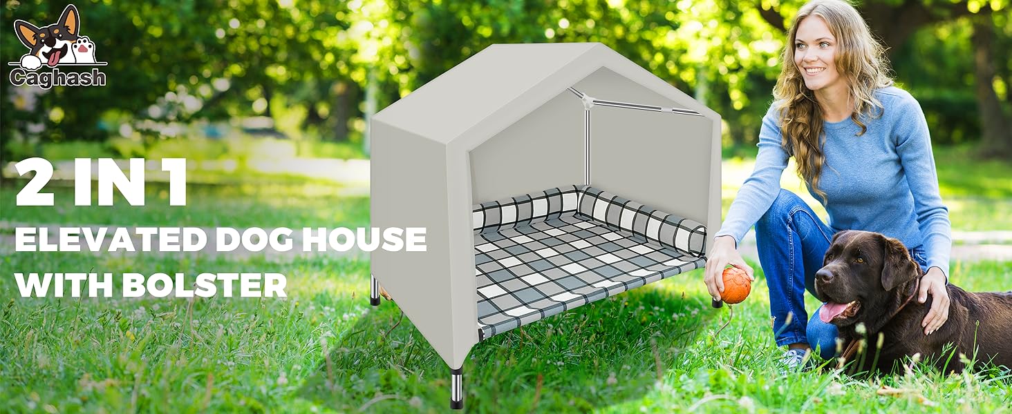 - 【2-IN-1 ELEVATED DOG HOUSE】 This dog house features a cozy pillow bed and tent cover, keeping pets off cold floors indoors and shielding them from wind, sun, and rain outdoors. Perfect for all-season comfort and security!