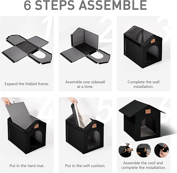 - Easy to Assemble & No Tool Needed: This collapsible outdoor cat house can be easily disassembled and installed in a matter of seconds. Only by the velcro to connect, no other tools needed. No matter where you set up your outdoor cat house (in the garden, in the barn, in the forecourt or in the house), it won't make any difference to your cat.
