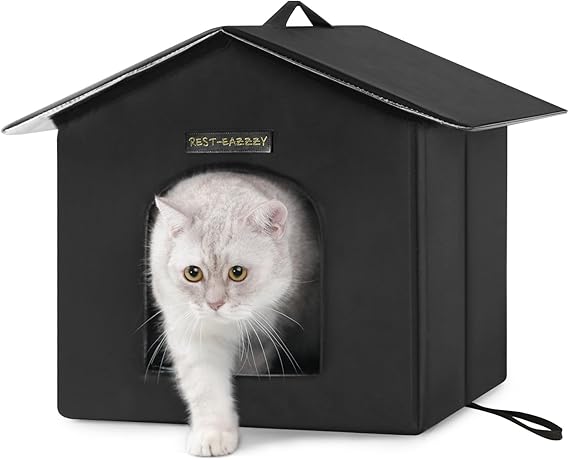 Rest-Eazzzy Outdoor Cat House, Feral Cat House Insulated with Mat and Clip, Weatherproof and Insulated, Cat Beds for Cats Kittens Puppies, Never Blow Away (Black, M 13" X 17" X 20")