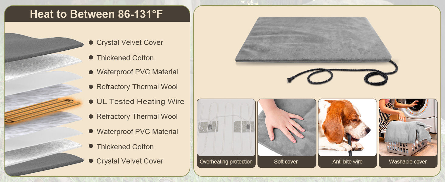 - QUICK HEATING: The heated pet house features a built-in heating pad that warms up to 86-131°F. It’s designed with a UL-compliant 9-layer safety system and built-in overheating protection. The removable cover is easy to clean and perfect for winter comfort.