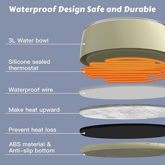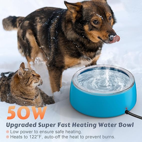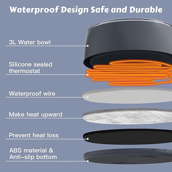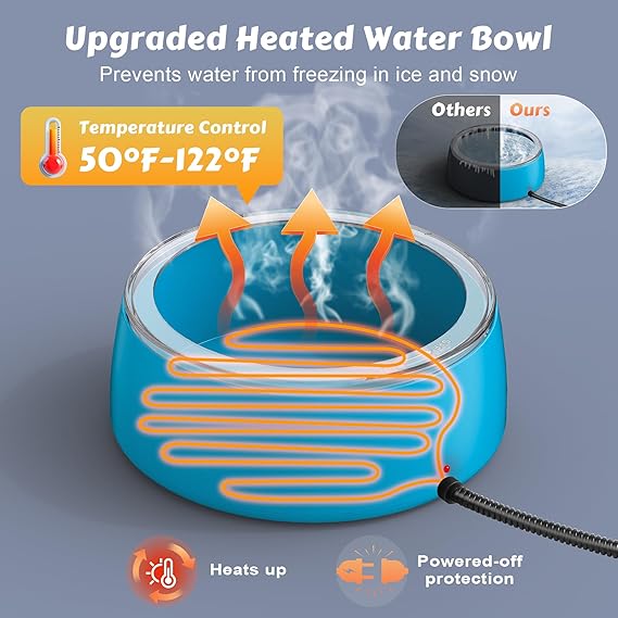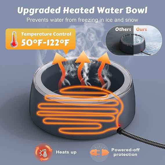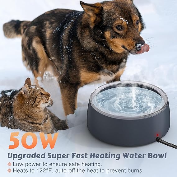 - Constant Temperature Heating: Plug it in and the heater automatically works, maintains a safe 50°F-122°F temp, effectively prevents water from freezing in cold weather, and ensures that pets have access to warm water at all times