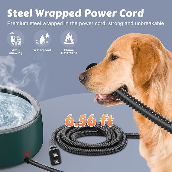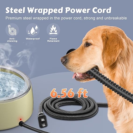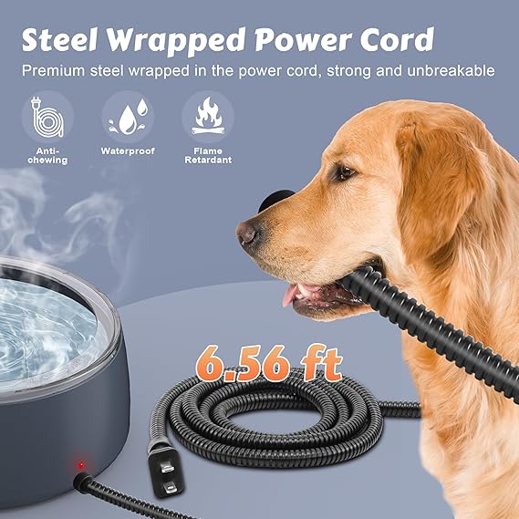 - Chew Resistant Power Cord: Our dog’s heated water bowl features a 6.56-ft steel-wire coated, chew-resistant power cord, tough and weatherproof, designed to protect against gnawing for pet’s safe drinking