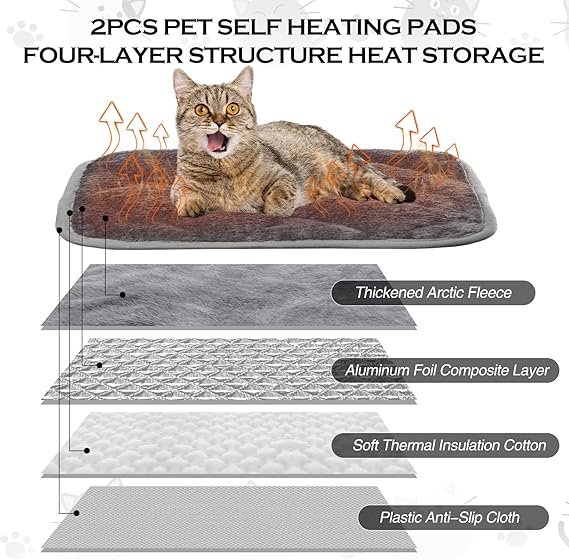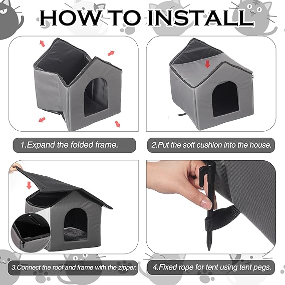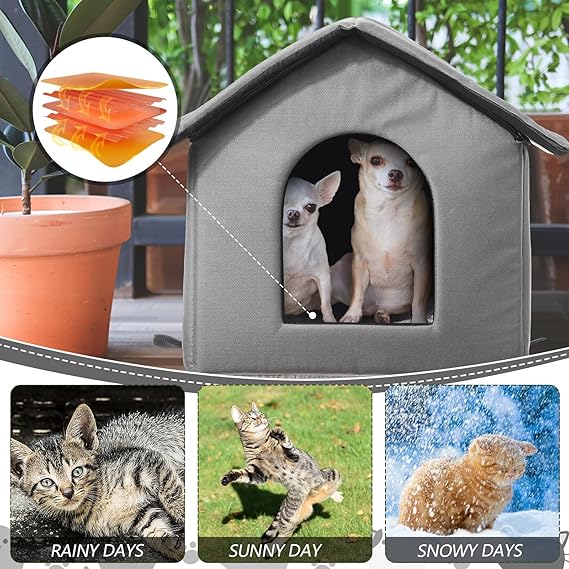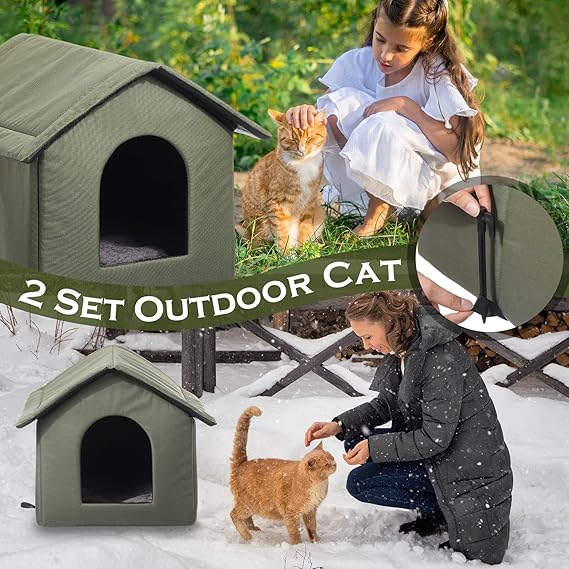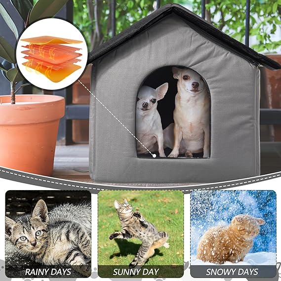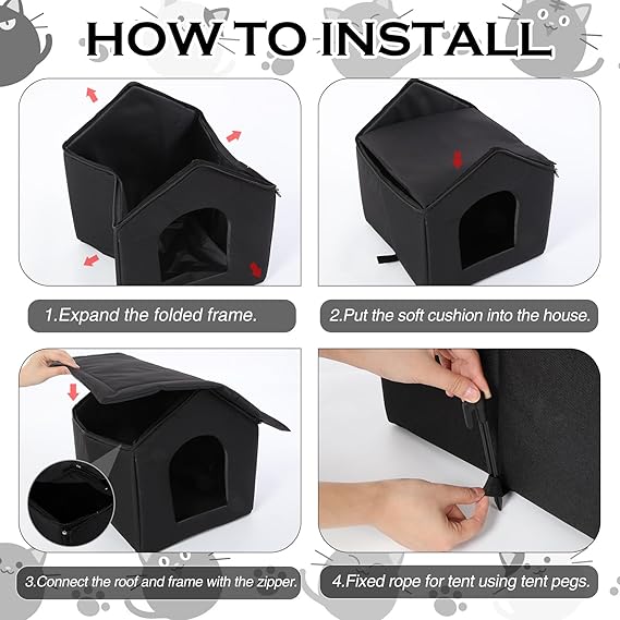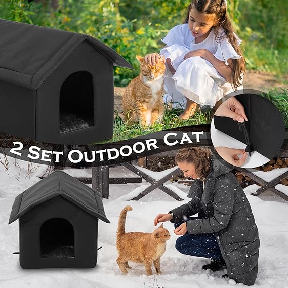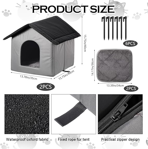 2 Sets Outdoor Cat Shelter with Self Heating Cat Pad Included 15.8 Inch Waterproof Stray Shelter Self Warming Pad Outside Pet Cave with Tent Stakes for Wild Animal Dogs(Black)