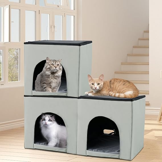 - EASY TO FOLD & SPACE SAVING: Enclosed cat houses & condos, heated outdoor cat house can be assembled quickly and can be folded into a flat shape for easy storage and travel. This collapsible cat cave bed fits into anywhere in your room. Place it next to your sofa, in your bedroom, or on a cube shelf organizer.