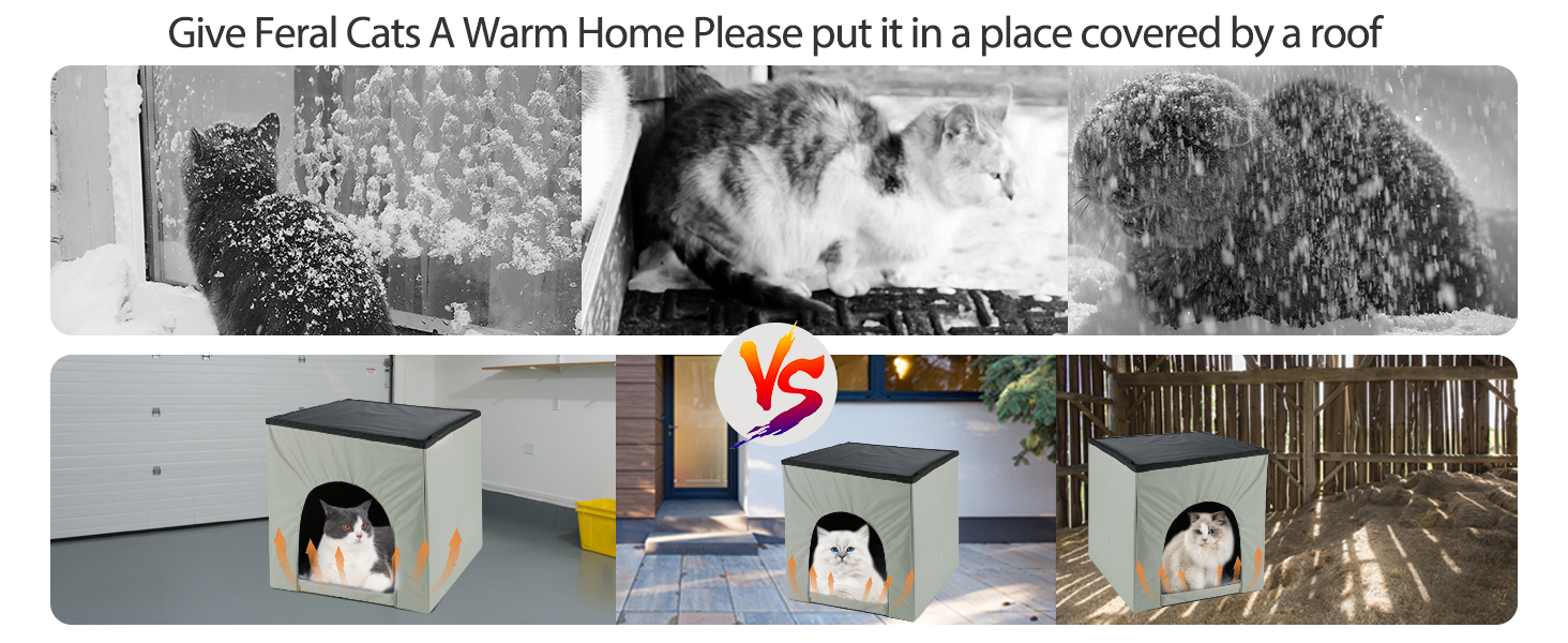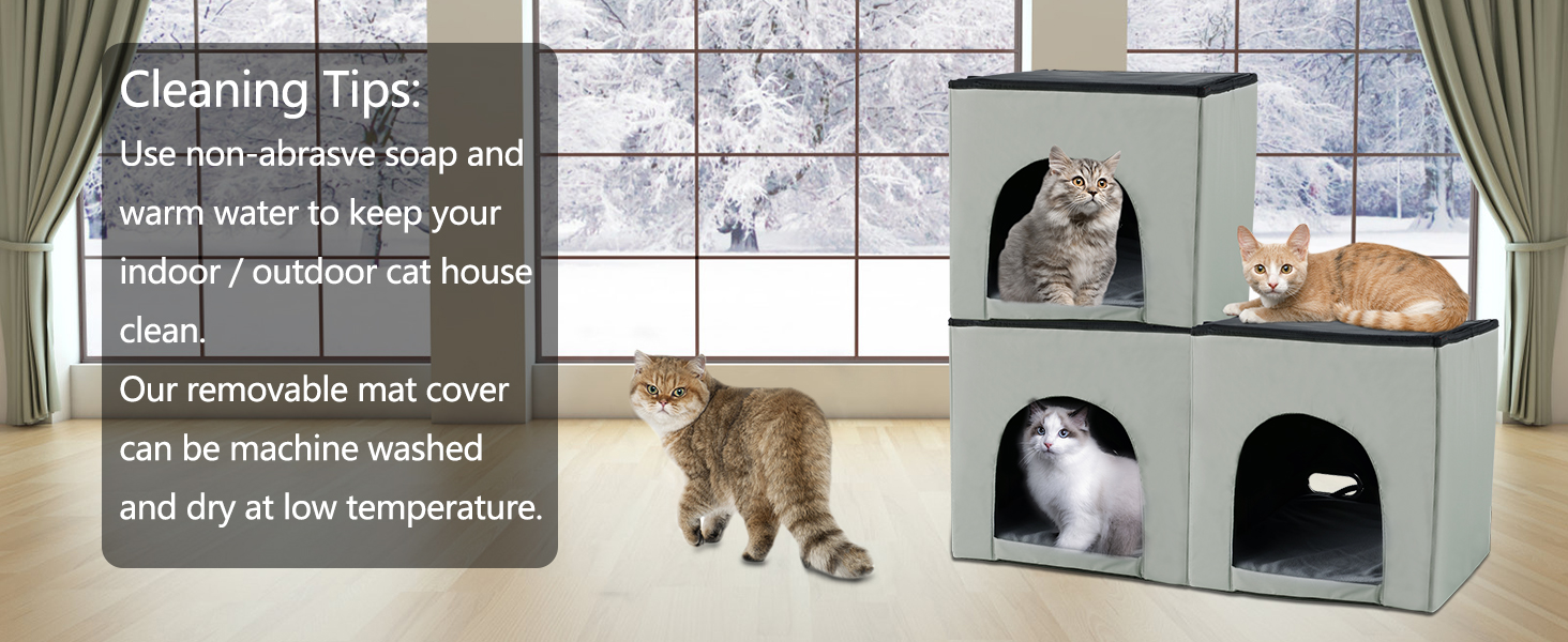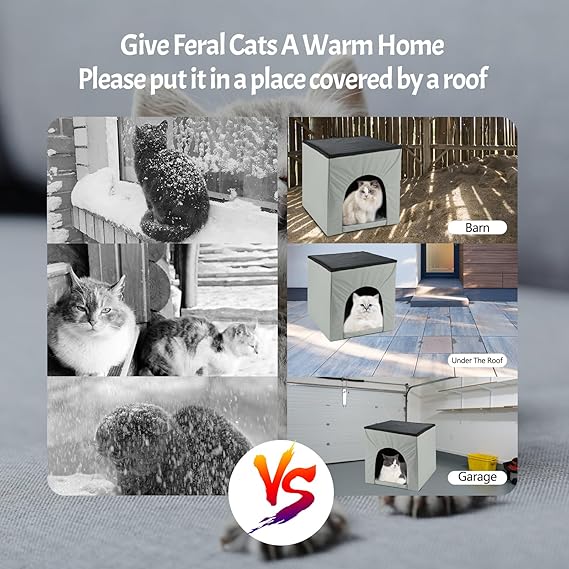 - CAN BE STACKED AND COMBINED IN A VARIETY OF WAYS: The unique cube structure allows our cat house to be stacked and combined as you need, creating a complete cat castle for your cat. Enclosed space to keep your cat feel warm and safe so that your cat can spend the cold season comfortably. We recommend that you try to place the heating room in a sheltered place to avoid direct exposure to sunlight or rain.