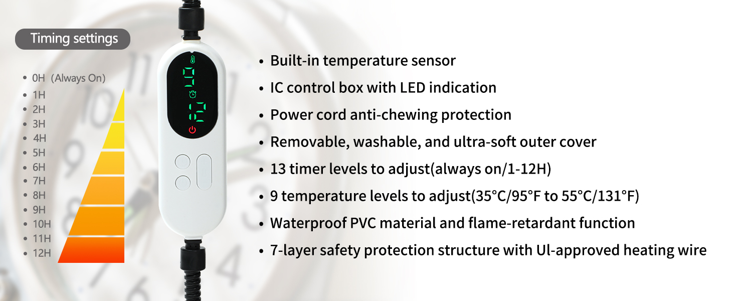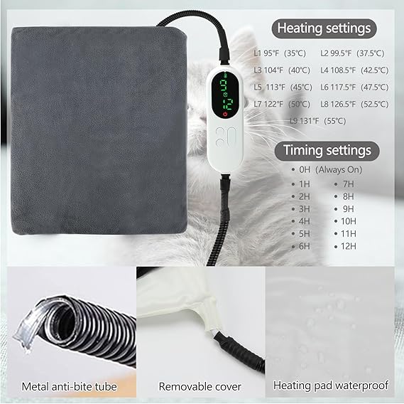 - CAT HOUSE WITH TIMER AND AUTO POWER OFF: We provide 7 adjustable temps and 13 timer settings, the temperature is set at 86℉~141℉(30℃~60℃) to maintain a comfortable temperature, a wider range of temperature and timer options(always on/1-12H). Your kitty will love the benefits of this heated cat shelter to snuggle up in during the cold chilly and winter months.
