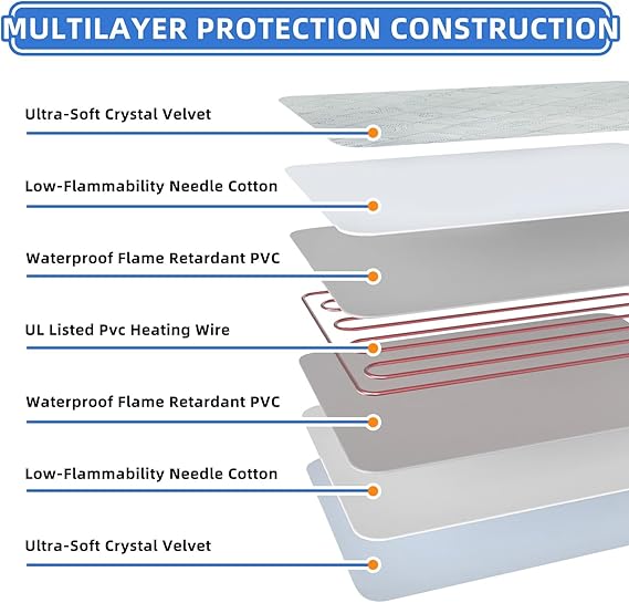 - 【Safety and Secure Structure】 There are 7-layer protective structure, include refractory thermal wool and UL approved heating wire structure will provide your pet with a gentle warm comfort and protect it from burns.And the soft PVC envelope with waterproof and flame-retardant function. Built-in intelligent temperature sensor in the heating pad to prevent overheating to protect pets.