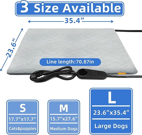 - 【Temperature & Timer Adjustable Function】Controlling the temperature of electric dog heating pad with the LED controller, it can adjust the temperature easily with 6 temperature settings ( 86-131℉/30-55℃) to accommodate your pets,and 5 Timer settings - 4H/8H/12H/24H.This Pet Heating Pad outdoor will automatically turn off according to your settings. In order for you to better take care of your pets and ensure the safety of electronic products, our products require you to manually turn them on and off every day, with a maximum heating time of 24 hours.