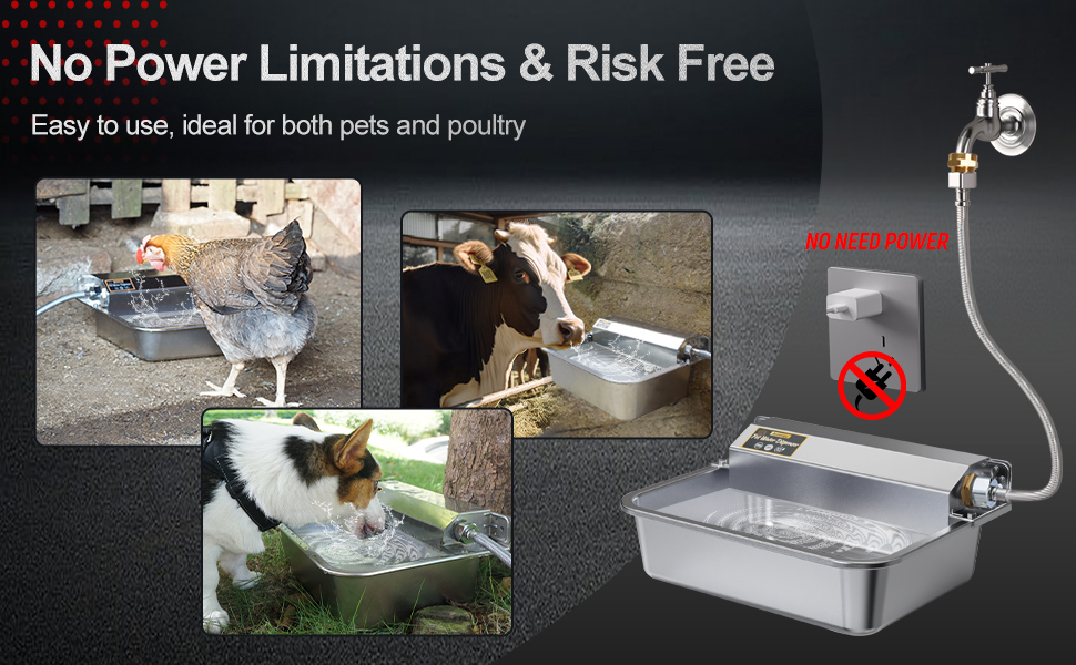 - [Patented Automatic Water Fill Dispenser]: The automatic water dispenser controls the water level with a valve, ensuring a steady supply without electricity, removing any shock risk. The valve automatically fills and stops filling at the set water level, providing clean water for pets and poultry. Eco-friendly and safe, it's ideal for both indoor and outdoor settings
