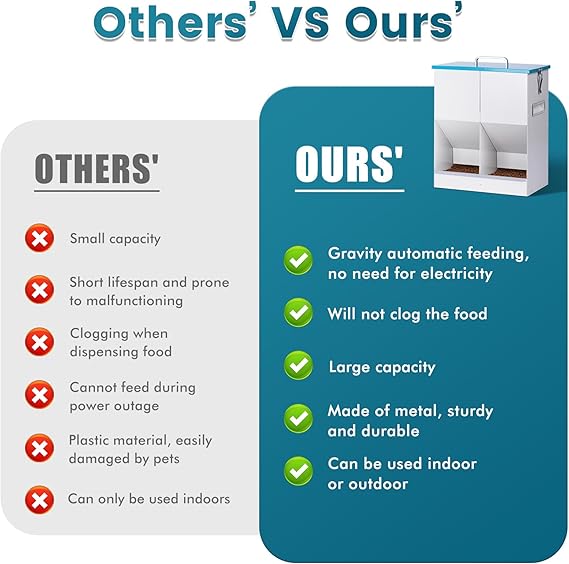 - This GRAVITY AUTOMATIC FEEDER solves all your pet feeding woes! Say goodbye to the stress of power outages and clogged food dispensers with our innovative gravity-based feeding system. No electricity required, so you can rest assured that your furry friends will always have access to their food