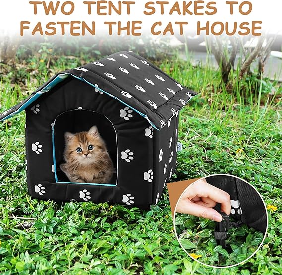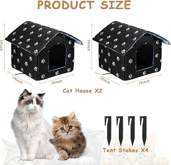 2PCS Cat House for Outdoor and Feral Cats, Weatherproof Shelter With 4 Tent Stakes, 2 Black Paw Print Foldable Dogs House, Stray Cat Protection