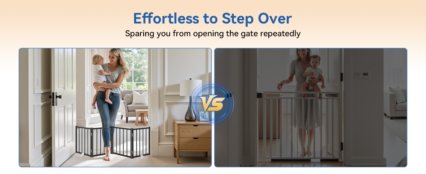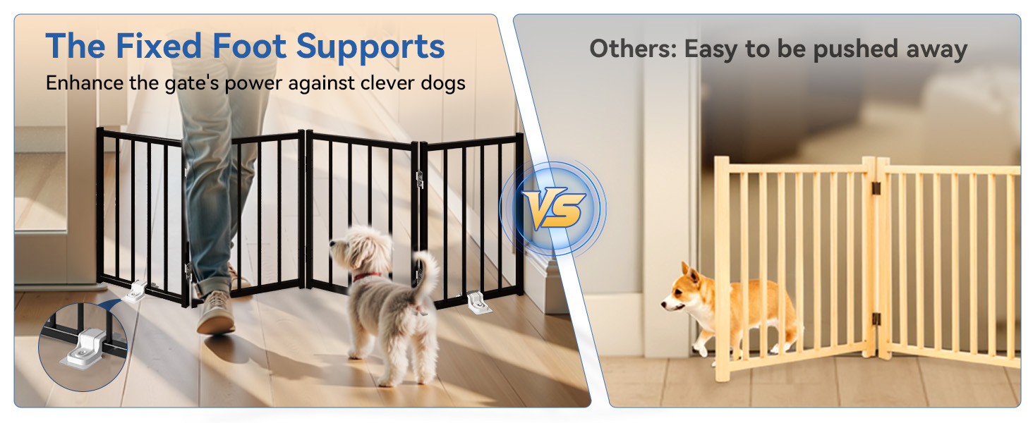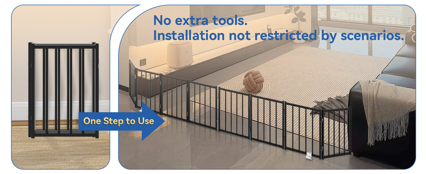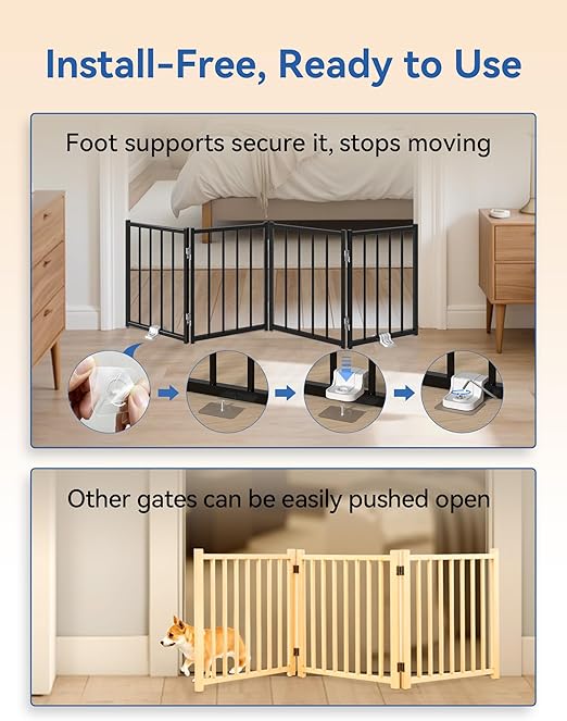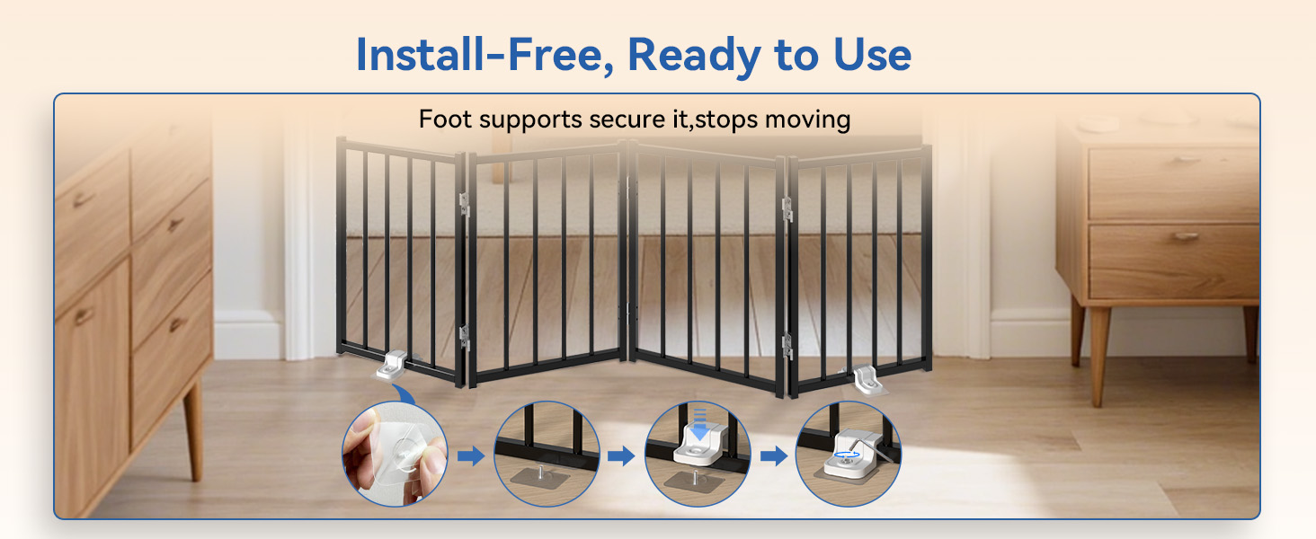 - Compact and Foldable Design: The free stand gate folds into a compact, flat shape, allowing for simple storage and convenient traveling. It’s a great option for apartment living, tiny spaces, and flexible use scenarios