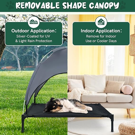 - Specification: The elevated dog bed measures 36”L x 30”W x 3.14”H, and the canopy is 31 inches high.Package includes 1 elevated dog bed, 1 removable canopy, 1 storage bag, and all essential hardware for quick assembly—everything you need in one box.