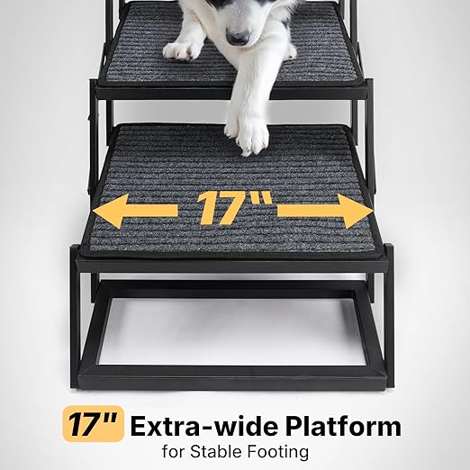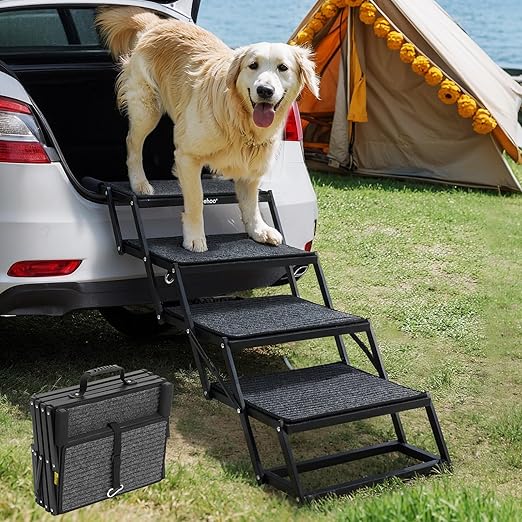 Veehoo Foldable Dog Steps for Large Dogs, 4 Steps Folding Dog Ramp for Car Vehicle 17" Wide, Heavy Duty Outdoor Pet Stairs Ladder Portable with Non Slip Rug Surface for Dogs, Support up to 200 lbs